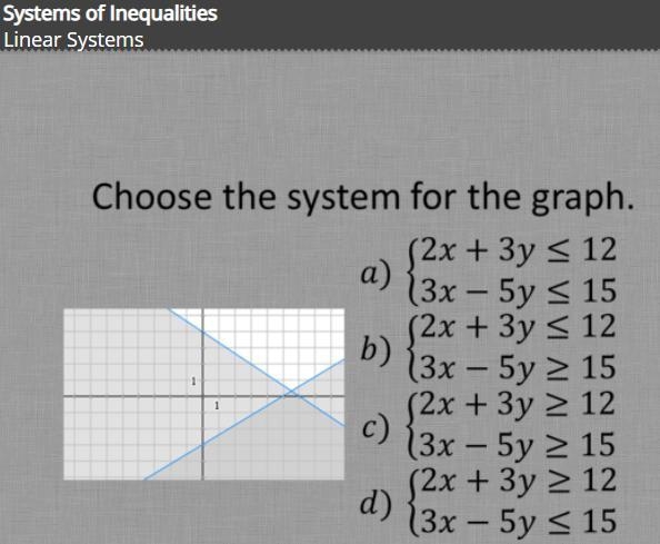 The line with positive slope is 3x-5y≥15 and the line with negative slope is 2x+3y≤12.