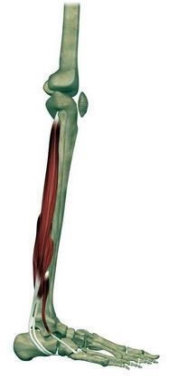 The fibularis longus starts at the top of the fibula and attaches to the first metatarsal bone of the foot.