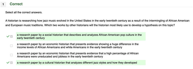 A historian is researching how jazz music evolved in the United States in the early twentieth century as a result of the intermingling of African American and European music traditions. Which two works by other historians will the historian most likely use to develop a hypothesis on this topic?