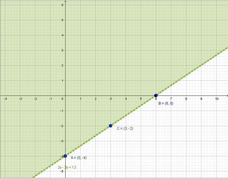 2x-3y<12\\\\2(0)-3(-4)<12\\12<12 \:F\\2(3) -3(-2)<12\\6+6<12 \: F