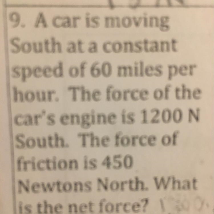 When you are trying to find net force for two different directions or sides you would subtract the bigger number by the smaller one. So, 1200 - 450 = 450 Newton's south. It is an unbalanced force because there is more force on one side than the other.