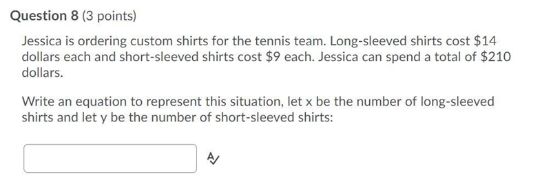 Jessica is ordering custom shirts for the tennis team. Long-sleeve shirts cost $14 dollars each and short-sleeved shirts cost $9 each. Jessica can spend a total of $210 dollars. Write an equation to represent
