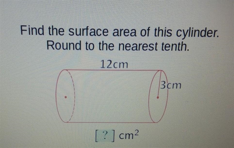 surface area of cylinder = 2π*3² + 2π*3*12 = 90π ≈ 90*3.14 ≈ 282.7 (cm²)