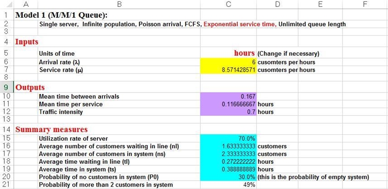b) 0.39 hours in the system and 0.27 hours in the queue. Thus a customer spends 69.23% of time in queue