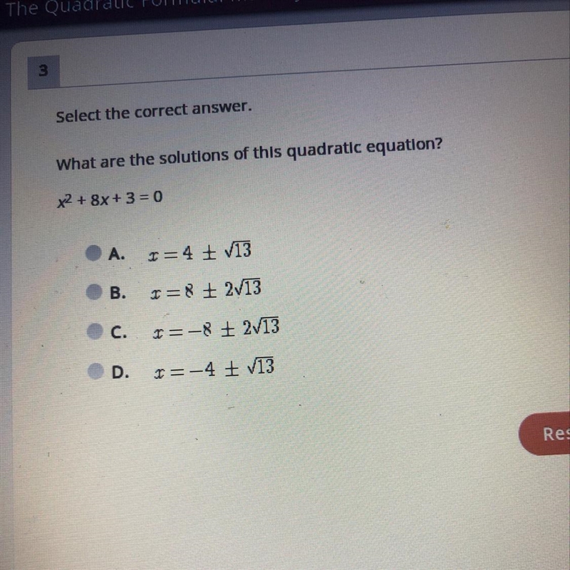 50 pts! what are the solutions of this quadratic equation? x^2+8x+3=0