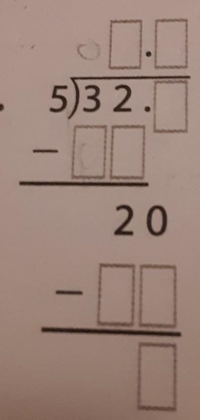 the first box in the top is 6 because 5 goes into 32 five times, then you subtract 32-30 which gives you your 20 at the bottom, then 5 goes into 20 4times, so you put the 4 in the second box on the top