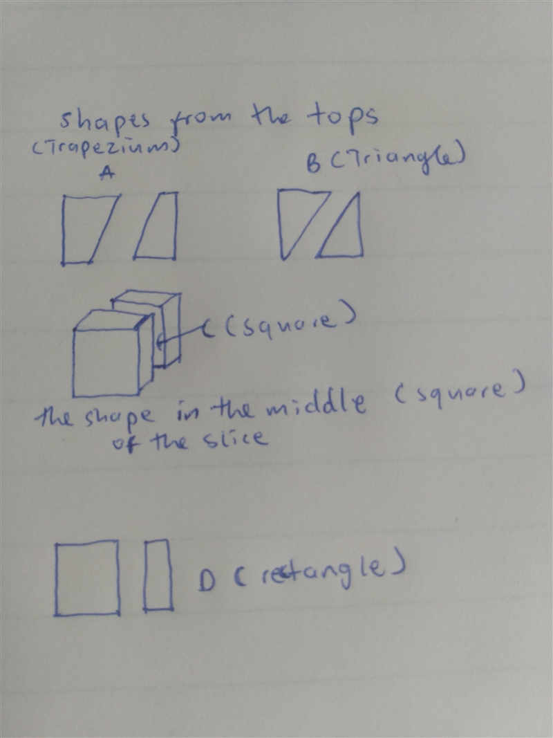 Cutting the cube from above, in a way that the slice is diagonal, making the slice touches two points that's almost at the edges diagonally facing each other of the cube will give a Trapezium (A)