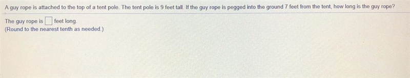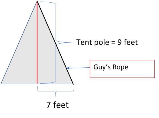 In the figure attached to this solution a right angled triangle is formed with height as tent pole (9 feet), base as distance of rope pegged into ground from tent pole (7 feet) and hypotenuse as the guy's rope.