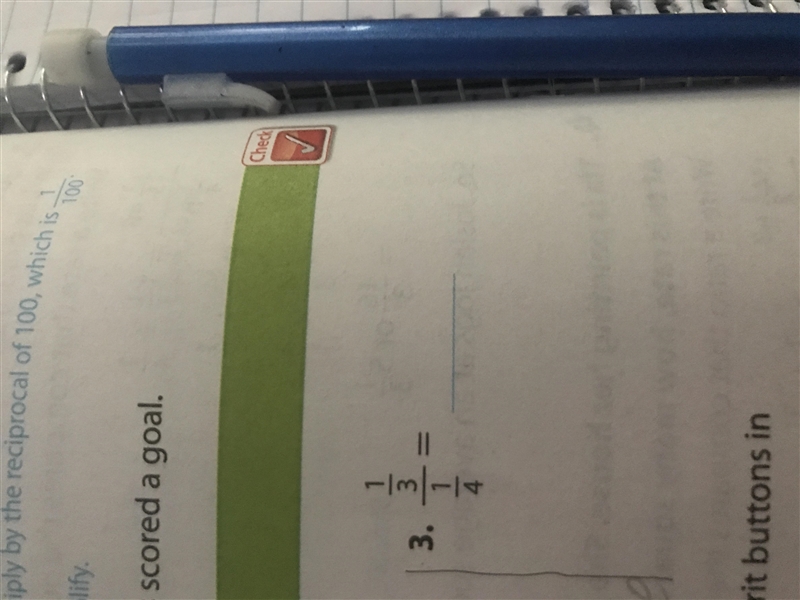 Divide 1/3 by 1/4. To do this, invert the divisor and multiply. In other words, invert 1/4 and multiply: