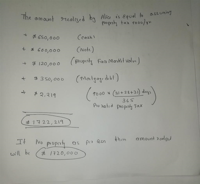 Alice owns land with an adjusted basis of $610,000 subject to a mortgage of $350,000. On April 1, Alice sells her land subject to the mortgage for $650,000 in cash, a note for $600,000, and property with a fair market value of $120,000. What is the amount realized?