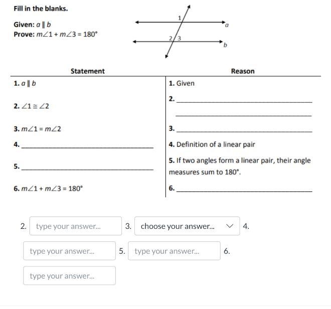 ⇒m∠2+m∠3=180°(If two angles form a linear pair, their angle measures sum to 180°)