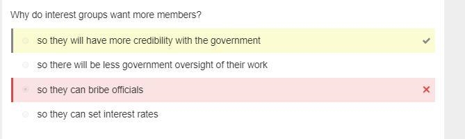 Why do intrest groups want more members? A.) So they can bribe officials? B.) So they will have more credibility with the government C.) So there will be less government oversig…