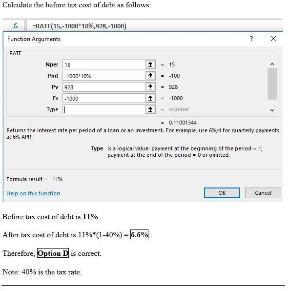 "Easy Rider Inc. sold a 15 year $1,000 face value bond with a 10 percent coupon rate. Interest is paid annually. After flotation costs, Easy Rider received $928 per bond. Compute the after-tax cost of debt for these bonds if the firm's marginal tax rate is 40 percent.