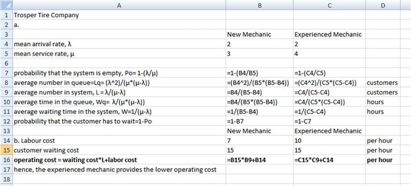 Trosper Tire Company has decided to hire a new mechanic to handle all tire changes for customers ordering a new set of tires. Two mechanics are available for the job. One mechanic has limited experience and can be hired for $7 per hour. It is expected that this mechanic can service an average of three customers per hour. A mechanic with several years of experience is also being considered for the job. This mechanic can service an average of four customers per hour, but must be paid $10 per hour. Assume that customers arrive at the Trosper garage at the rate of two per hour. a) Compute waiting-line operating characteristics for each mechanic b) If the company assigns a customer waiting cost of $15 per hour, which mechanic provides the lower operating cost? Note: this is the cost of customer waiting in the system.