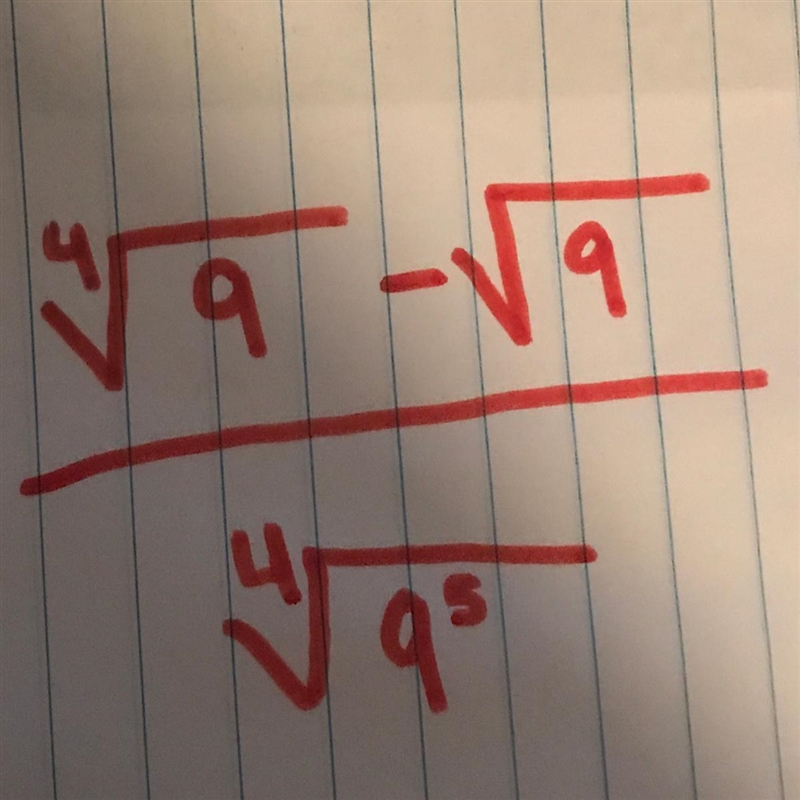 ![\displaystyle \frac{\sqrt[4]{9}-√(9)}{\sqrt[4]{9^5}}](https://img.qammunity.org/2020/formulas/mathematics/middle-school/mdhd9n3lhkqimc3ljo0ywa1nvg5cqnki7e.png)
