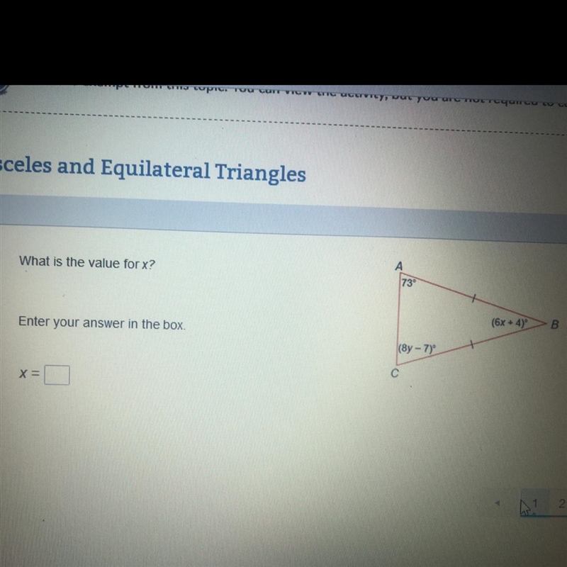 Since the triangle is an equilateral triangle, angle C is equivilant to angle A. Thus, 73 = 8y-7 y = 10 Since y = 10, you can use the fact that a triangle is 180 degrees to find out x by using 73 + 73 + 6x + 4 = 180. X = 5