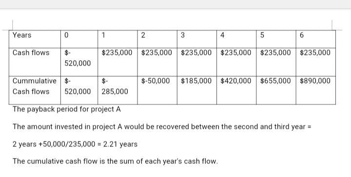 The payback period measures how long it takes for the amount invested in a project to be recovered from the cummulative cash flows.