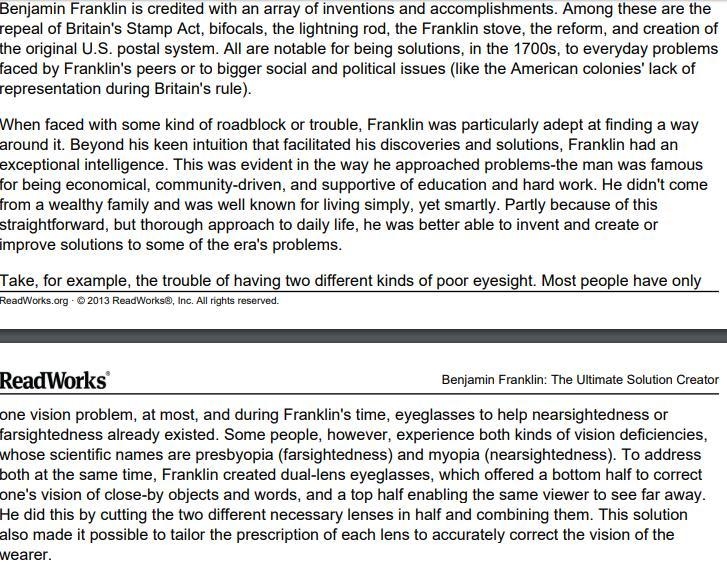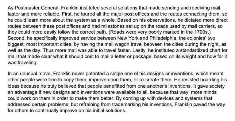 Why was Benjamin Franklin "the ultimate solution creator"? Provide TWO examples from the text to support your answer. You must use the RACE strategy to answer the ques…