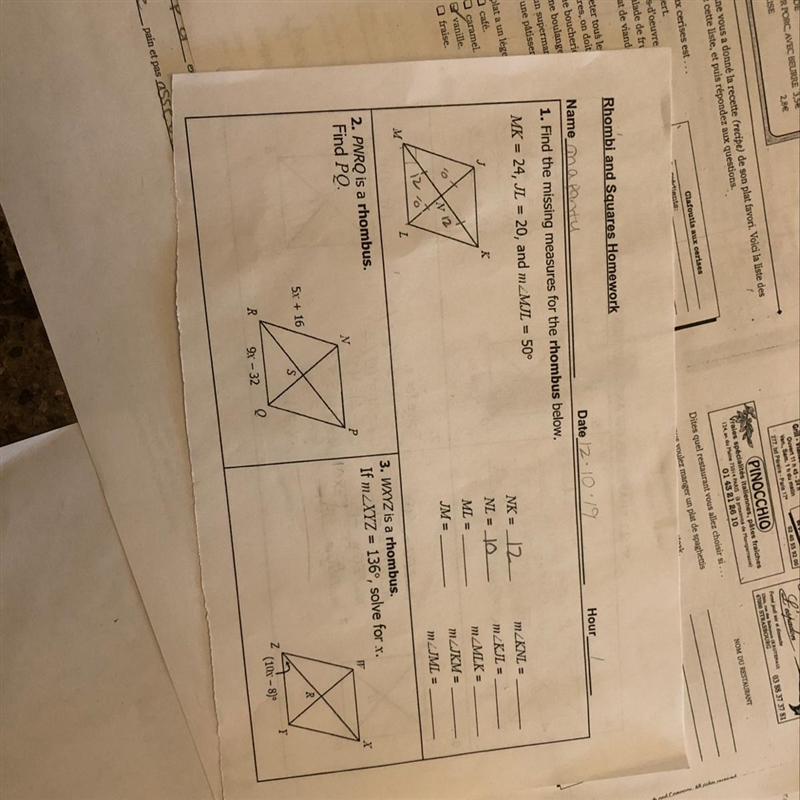 Angle KNL = angle JML = 90 degrees. This is so because the diagonals are perpendicular)
