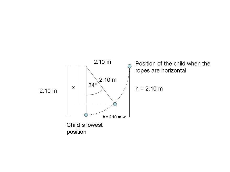 b) When the ropes make a 34.0° with the vertical, the height of the child is 2.10 m minus x (see figure). To find x, we can use trigonometry of right triangles: