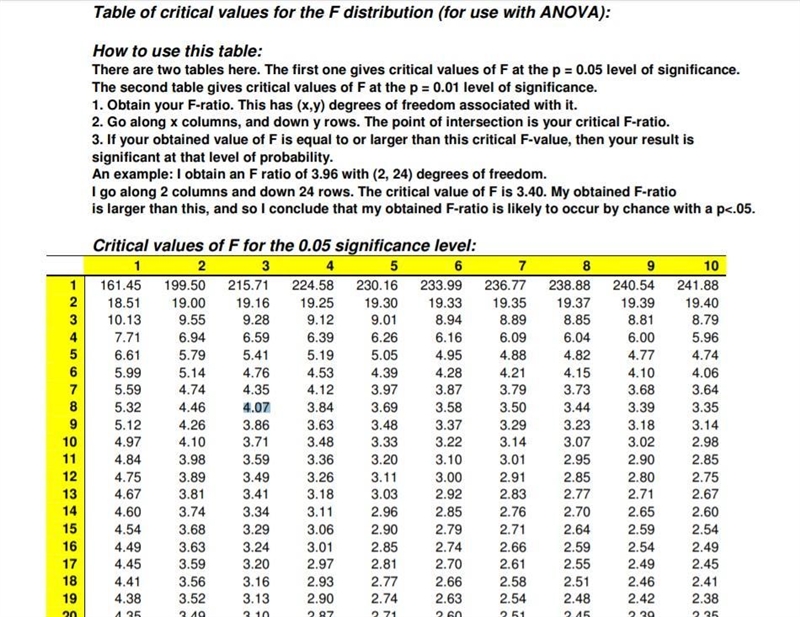 We know that the level of significance we are using is α = 0.05, so to find the critical value F we need to look at some table of critical values for the F distribution for the 0.05 significance level (like the attached image). Then we just need to look fot the value that is located in the intersection between the degrees of freedom we have in the numerator (horizontal) and the denominator (vertical) of the statistic (3 and 8). That critical value is: