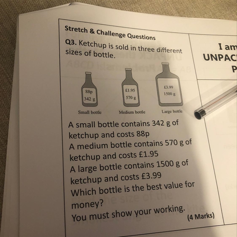 Since the per gram Ketchup cost is smallest in the small bottle of Ketchup, therefore, the small bottle is the best value for money. (Answer)
