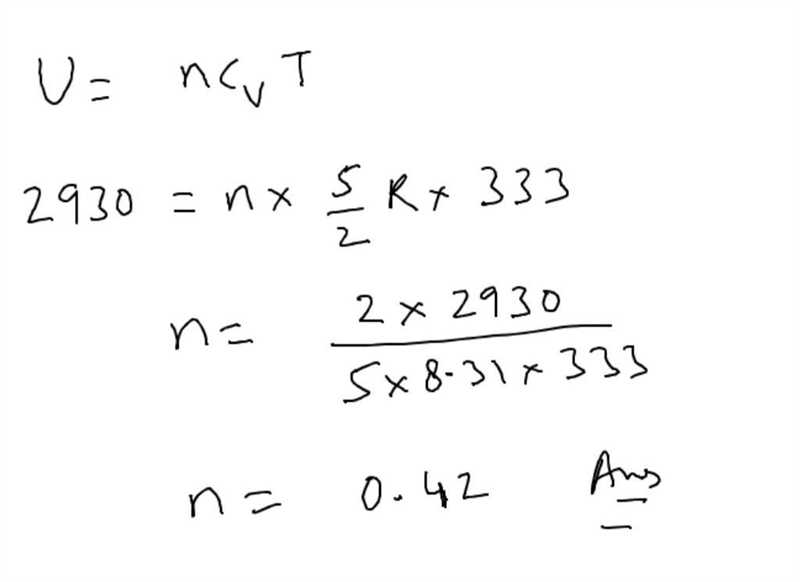 A diatomic gas at 333 k has an internal energy of 2930 j. how many moles are present (unit=mol)