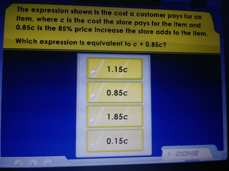 The answer would be 1.85, because .85 is 85% so it is 85% out of 100% which means it is .85 out of 1.00, which makes 1.00 c so you add 1.00 and .80 and get 1.85