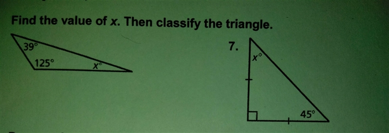 For question 7, the triangle has a box that indicates one of its known angles is 90 degrees. So our equation is 90 + 45 + x = 180. Let's solve and then classify: