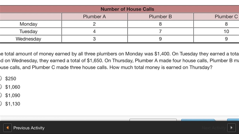 On Tuesday they earned a total of $1,660,On Tuesday Plumber A has 4 calls , Plumber B has 7 calls and Plumber C has 10 calls.