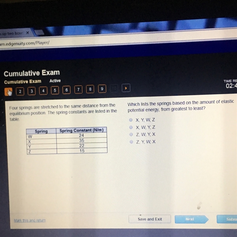 Four springs are stretched to the same distance from the equilibrium position. The spring constants are listed in the table.