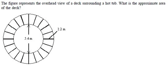 I would go with 75.4 square meters. Since the circle in the middle has a diameter of 5.4m and on either side of the middle circle, it’s 2.2m to the edge of the deck. 5.4 + 2.2 + 2.2 = 9.8. The diameter if the deck (one large circle) is 9.8m. To find area, we use pi*radius squared. The radius of the deck is 4.9 m. 4.9 x 4.9 is 24.01. 24.01 x Pi is approximately 75.39m squared, so rounded to 75.4m squared.