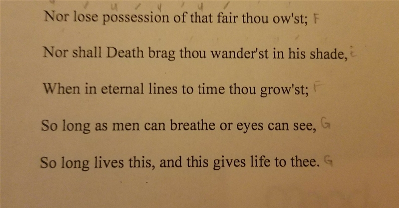 This is an excerpt from Sonnet 18 written by Shakespeare. If you know anything about Shakespeare's sonnets, you know that they always have a regular meter, which means that all of them are written in iambic pentameter. This means that the first syllable is unstressed, and it is followed by a stressed syllable.