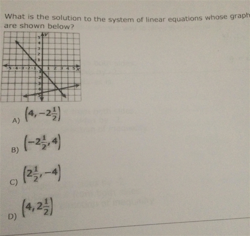 The solution to the system of linear equation is where the the x axis intercept the y axis..