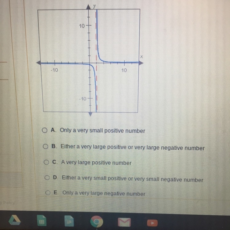 There is a vertical asymptote at x=2. From this graph, we can see that as the values of x approach 2, the graph goes up sharply and down sharply. This means the values would be either very large positive numbers or very large negative numbers.
