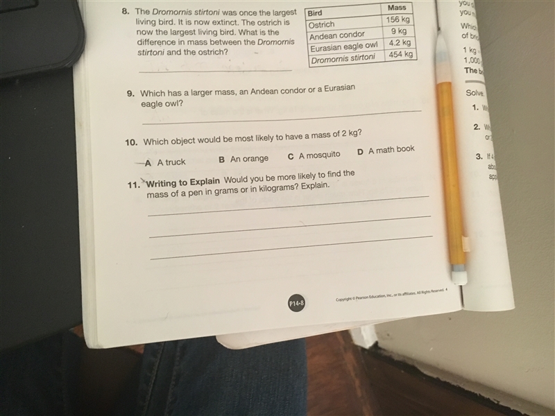 10. A truck is way heavier than 2 kg. An orange and mosquito are way lighter than 2 kg. A math book is about 2 kg.