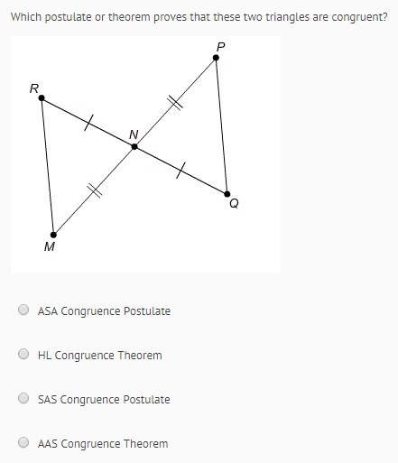 SAS. Sides because PN and MN are congruent as well as RN and QN. Since angle PNQ and angle MNR are vertical angles they are also congruent.