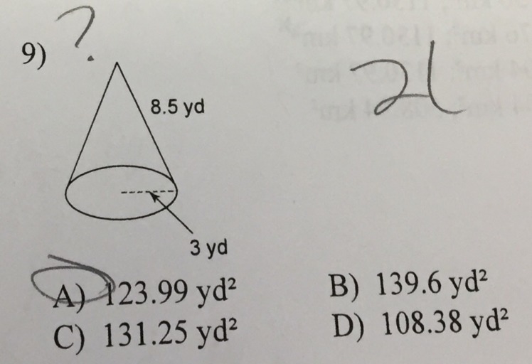Surface area = 3.14 x 3*(3+ sqrt(7.95^2 +3^2) = 108.38 yd^2