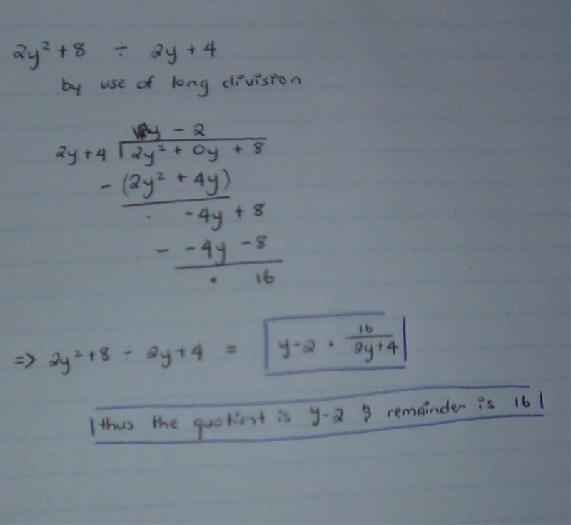 To divide 2y² + 8 by 2y + 4, use long division to find the quotient and remainder.