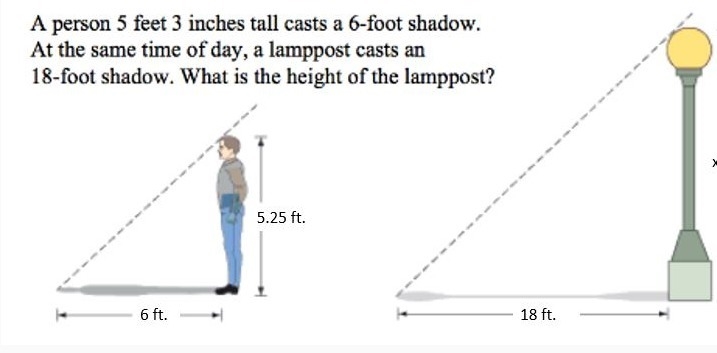 As you can see the length of the one with the man is 6 and the length with the lamp post is 18 and we know that if you divide 18 by 6 you get 3 so then you mutiply 5.25 by 3. Then you get 15.75