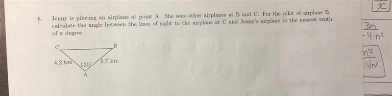 It states "For the pilot of airplane B, calculate the angle between the lines of sight to the airplane at C and Jenny's airplane [at point A]".