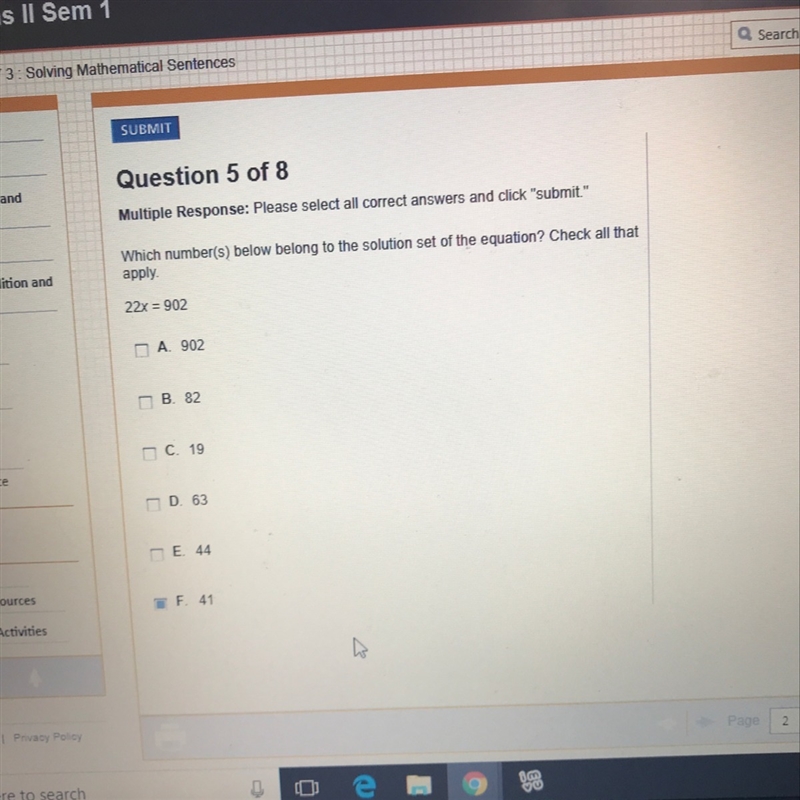 There's only one solution...the one you get when you divide both sides by 22 to solve for x. 902/22 = 41. That exponent on the x, the one you don't see, is a "1" which tells us that there is only 1 solution to this problem. If your x is squared, then you have 2 solutions; if it's cubed, you have 3, etc.