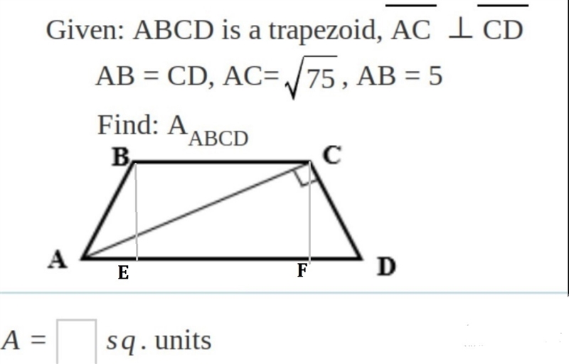 ![Area . trapezoid= (1)/(2) [(5+10) √(75)/2] \\ Area.trapezoid= (1)/(4) 15 √(75 ) \\ Area.trapezoid= (75)/(4) √(3)](https://img.qammunity.org/2019/formulas/mathematics/middle-school/ua01gnzu9g7izee7e5eshojq8m3ff26kus.png)
