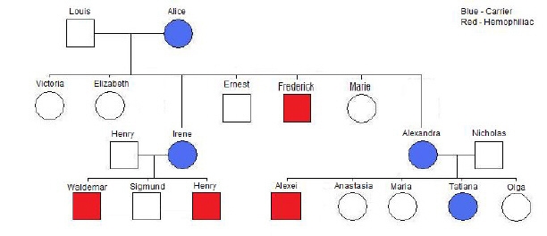 In the pedigree, marked with blue are the carriers of the X recessive allele ( they have one X that has the mutation and the other that doesn't).
