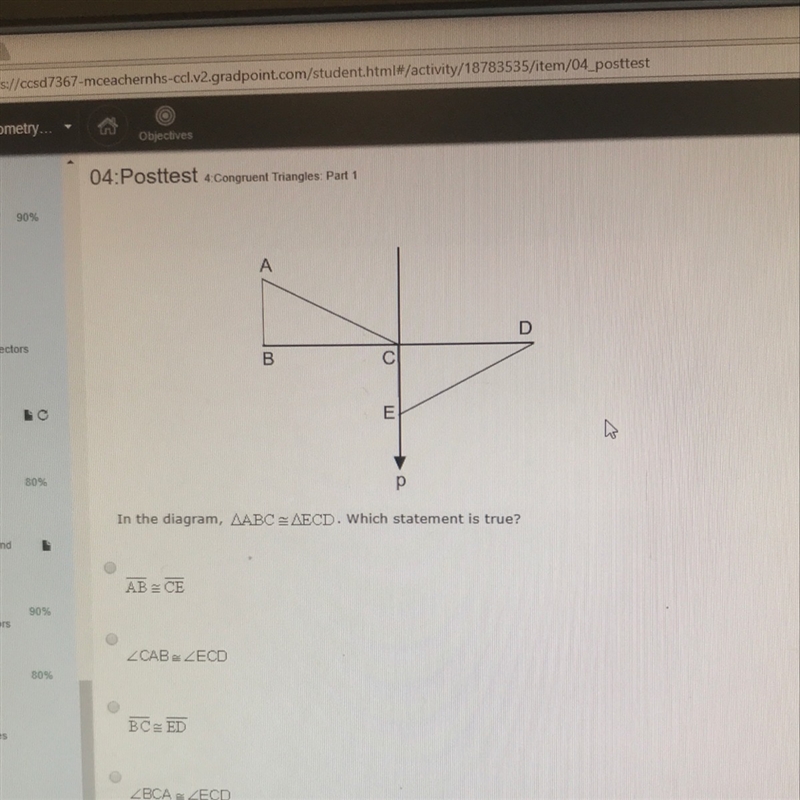 The first choice AB=CE is correct as they are corresponding sides which are congruent.
