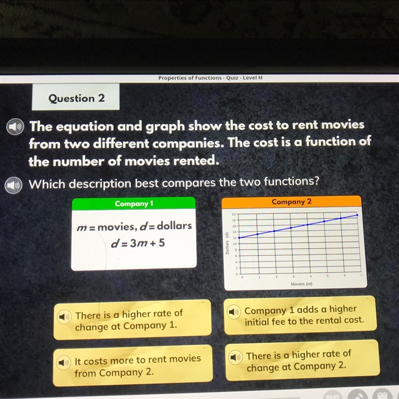 m= (12-14)/(0-2) which gives us a slope of 1. Now we can use that slope and the slope-intercept form of a line to find the y-intercept, which serves as the fee for renting from company 2. 14=1(2)+b and 14 = 2 + b and b = 12. The equation then for company 2 is y=1x+12. This means it costs $1 to rent movies, but your fee to rent, no matter how many movies you pick, is $12. The "rate of change" in the choices refers to the slope. The slope in company 1's equation is 3 and the slope in company 2's equation is 1. The best description is the first choice that says "There is a higher rate of change at Company 1".