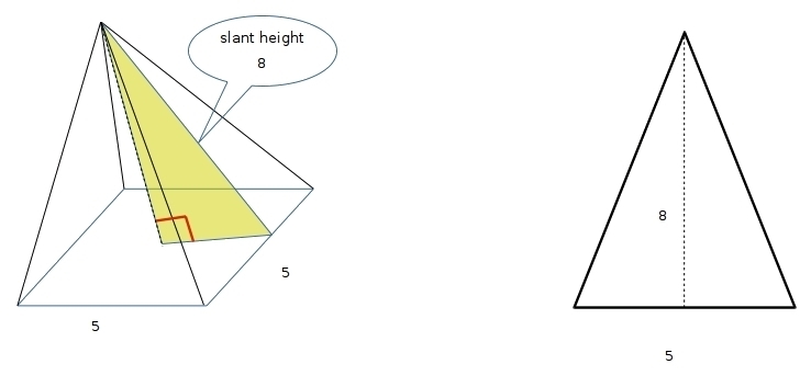 5x5 square at the bottom, now, if we just get the area of all 4 triangles and the square, sum them up, that's the area of the pyramid in feet.