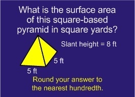 ![\bf \stackrel{\textit{4 triangles}}{4\left[ \cfrac{1}{2}(5)(8) \right]}~~+~~\stackrel{\textit{square}}{5\cdot 5}\implies 80+25\implies 105~feet^2 \\\\\\ \stackrel{\textit{there are }9ft^2\textit{ in }1yd^2}{105\underline{ft^2}\cdot \cfrac{yd^2}{9\underline{ft^2}}\implies \cfrac{105}{9}yd^2\implies \cfrac{35}{3}yd^2\implies 11(2)/(3)~yd^2}](https://img.qammunity.org/2019/formulas/mathematics/high-school/8p5uy2vz97c83xkrkgbdq6hiqyp7dq1pif.png)