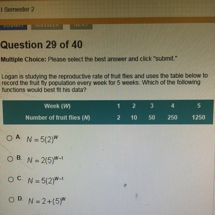 B is correct. Substitute the week number for w in the function. Follow order of operations and you should get you N, the number of fruit flies for that week. For instance week 2: