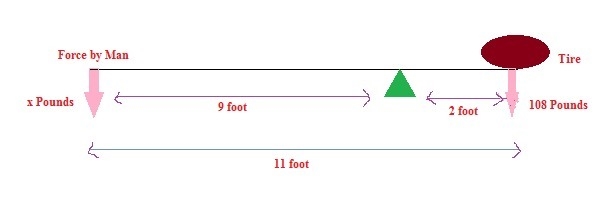 The tire is placed on one end of the bar and the man applies force on the other end. Rock is placed 2 feet from the tire. The total length of the bar is 11 feet. This means, the distance between man and the rock is 9 feet as shown in the mage below.